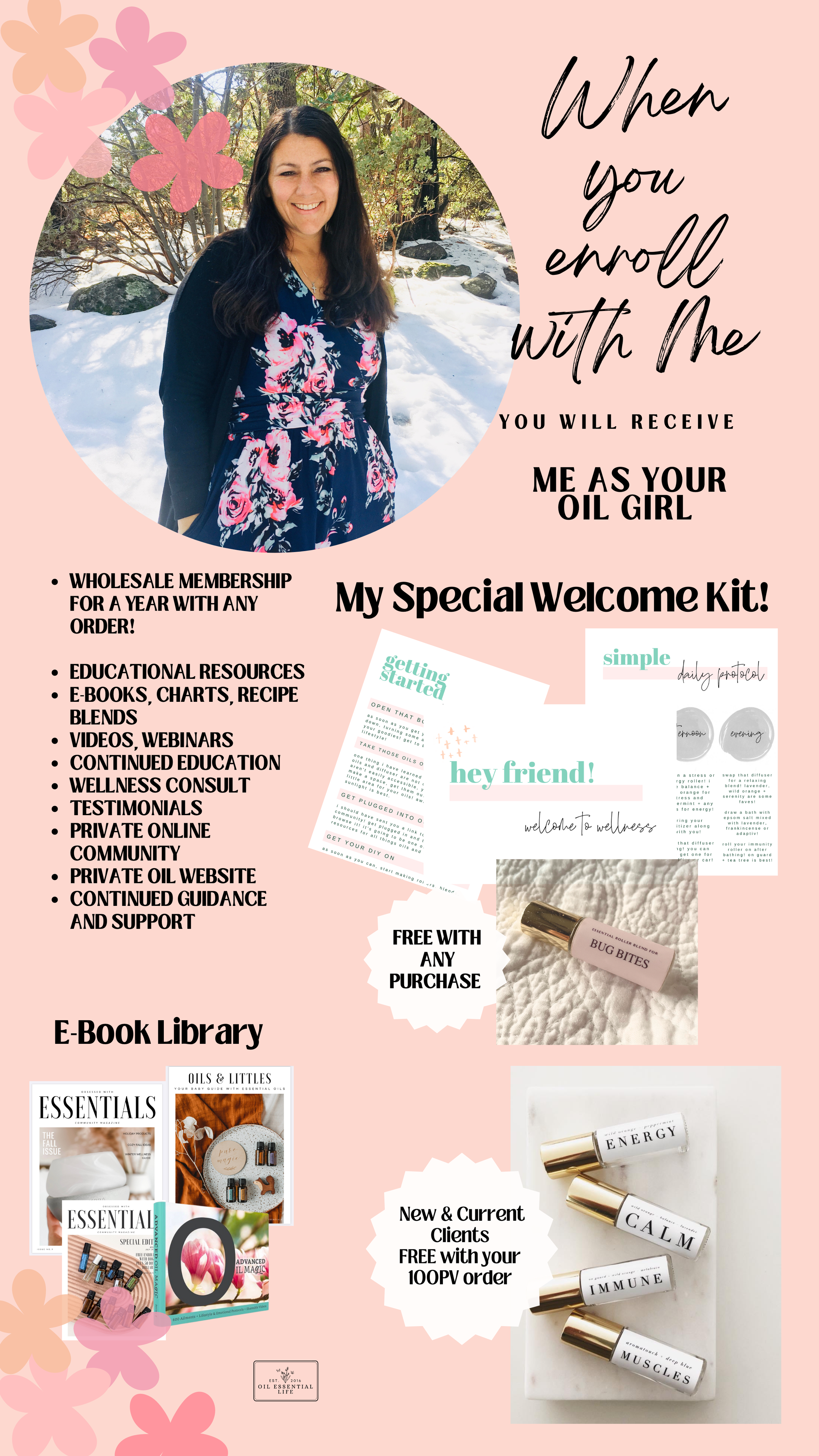You can choose 4 of my custom roller bottle blends, plus a special Cozy Winter Roller Bottle blend as my Welcome Gift to You!